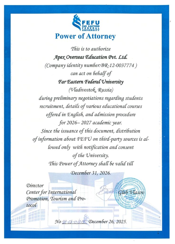 We are proud to be the official representative of Far Eastern Federal University (FEFU). FEFU has granted us the power of attorney to facilitate direct admissions, meaning you can apply without the need for any third-party agency or agent.Applying directly through us ensures safety, honesty, lower charges, and transparency.
